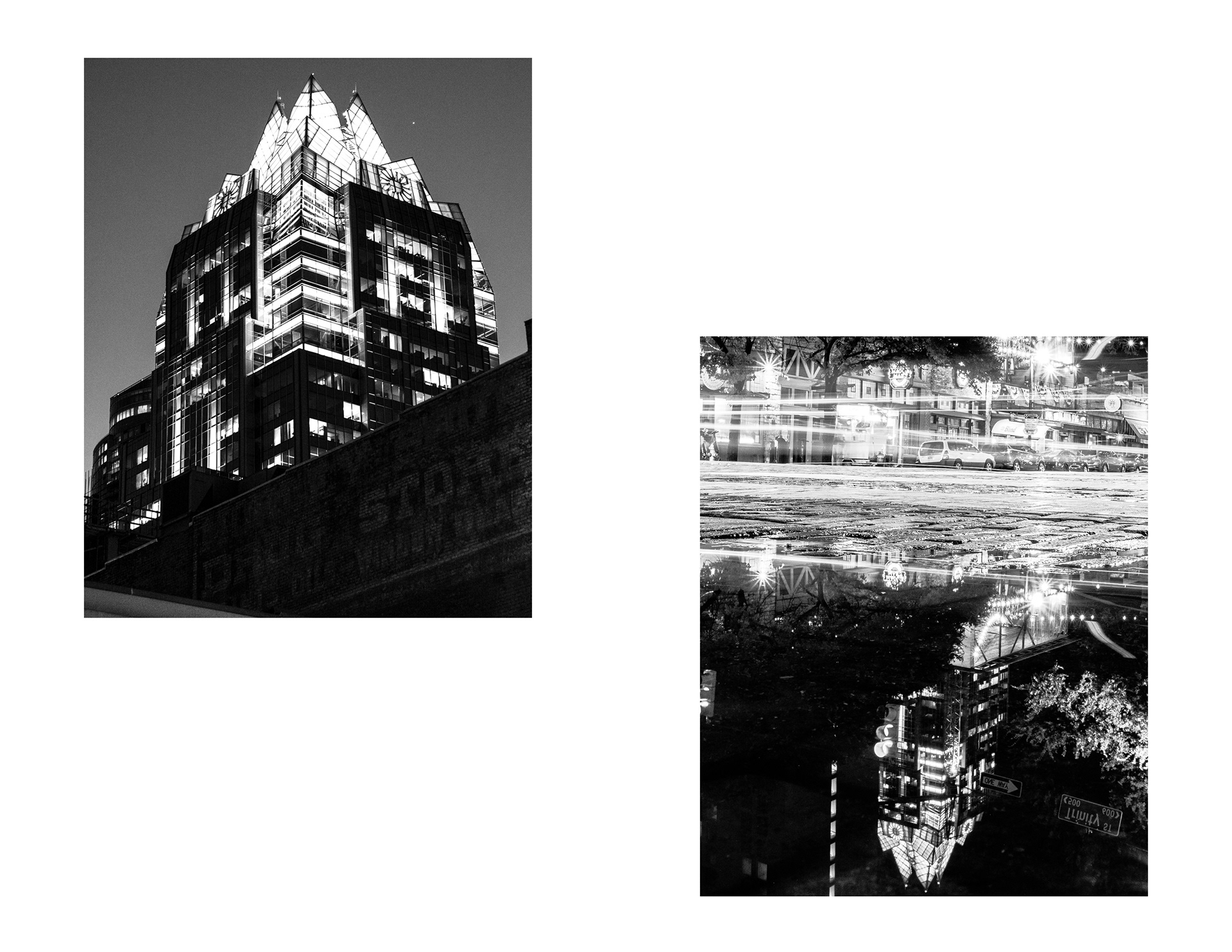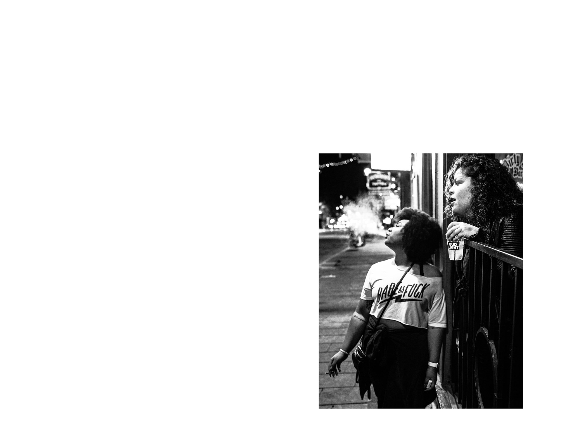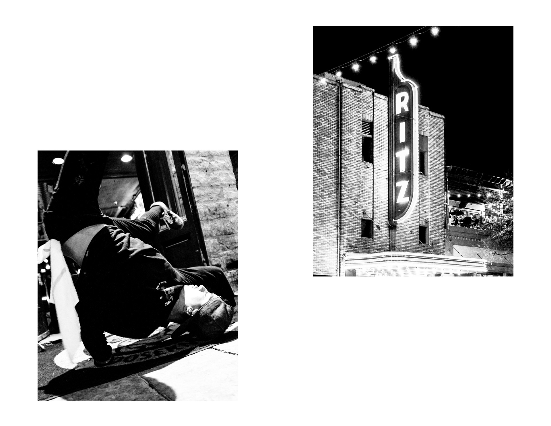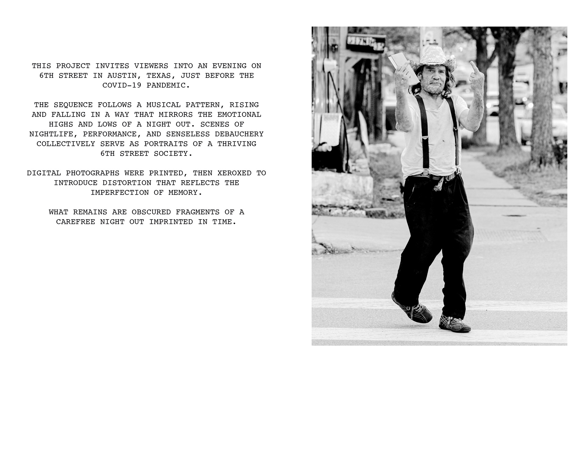 This project invites viewers into an evening on 6th Street in Austin, Texas, just before the COVID-19 pandemic. The sequence is arranged with a sense of rhythm in mind: images rise and fall in a way that mirrors the flow of a night out. Scenes depict senseless debauchery, an abundance of live music, and unobstructed views of the “Owl Tower” that collectively serve as portraits of a vibrant 6th street society. Digital photographs were printed, then xeroxed to introduce distortion that reflects the natural imperfection of memory. What remains are obscured fragments of a care-free night out imprinted in time.