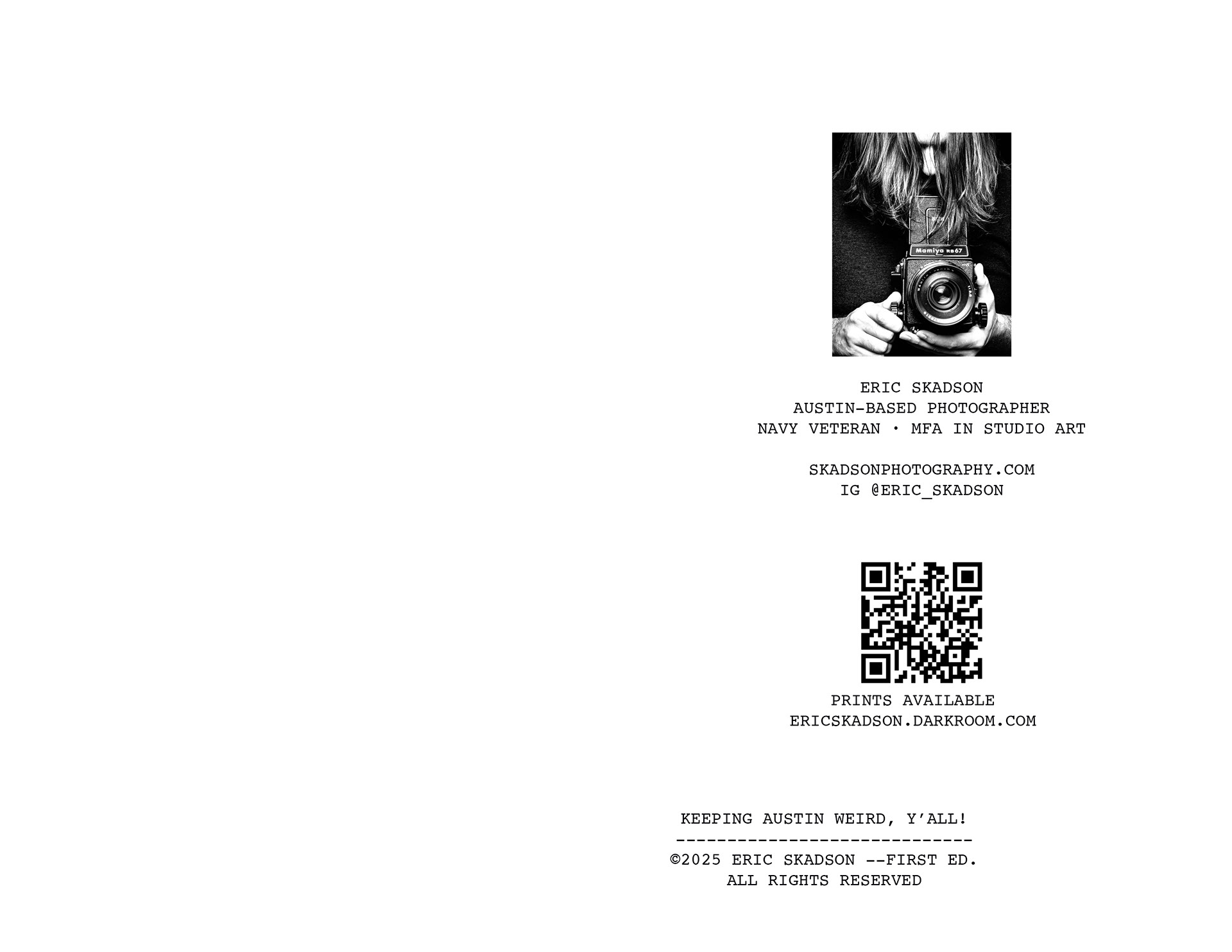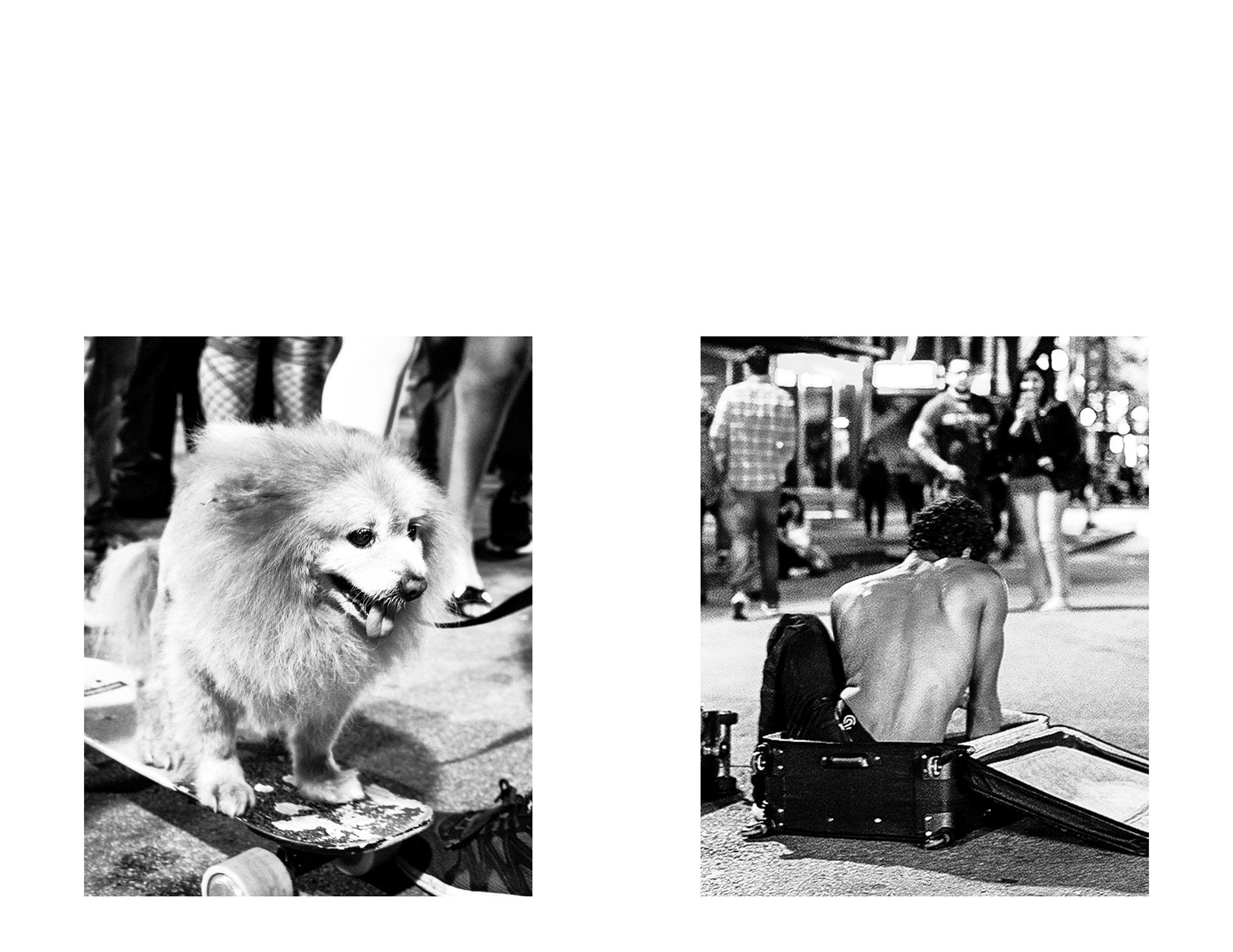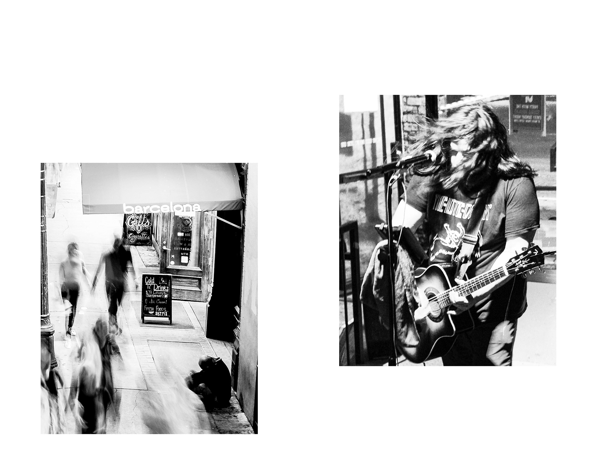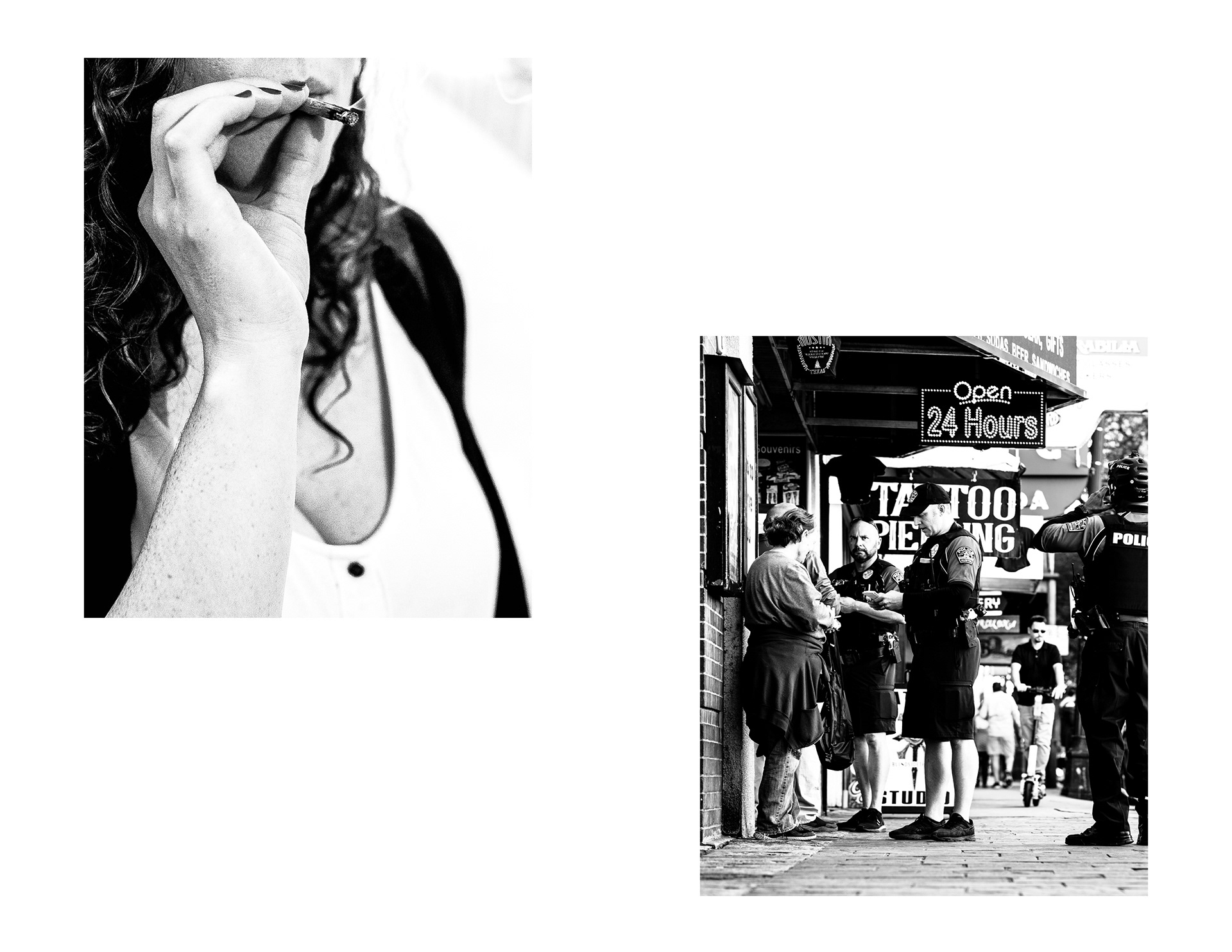 This project invites viewers into an evening on 6th Street in Austin, Texas, just before the COVID-19 pandemic. The sequence is arranged with a sense of rhythm in mind: images rise and fall in a way that mirrors the flow of a night out. Scenes depict senseless debauchery, an abundance of live music, and unobstructed views of the “Owl Tower” that collectively serve as portraits of a vibrant 6th street society. Digital photographs were printed, then xeroxed to introduce distortion that reflects the natural imperfection of memory. What remains are obscured fragments of a care-free night out imprinted in time.